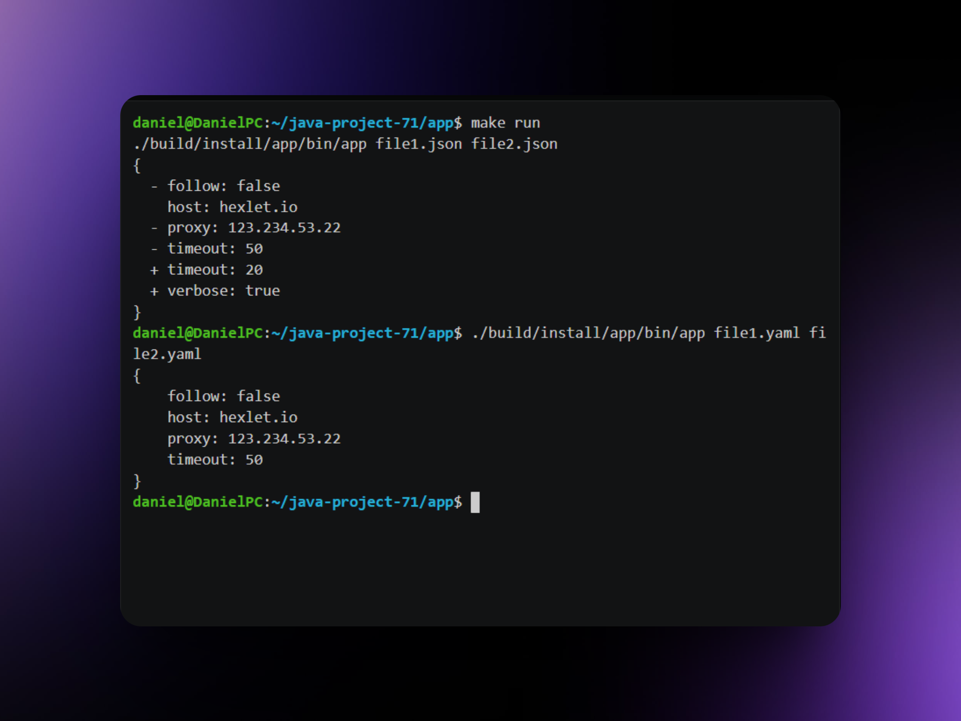 A terminal-based Java tool for comparing structured data in JSON and YAML formats. Displays differences in multiple output formats.