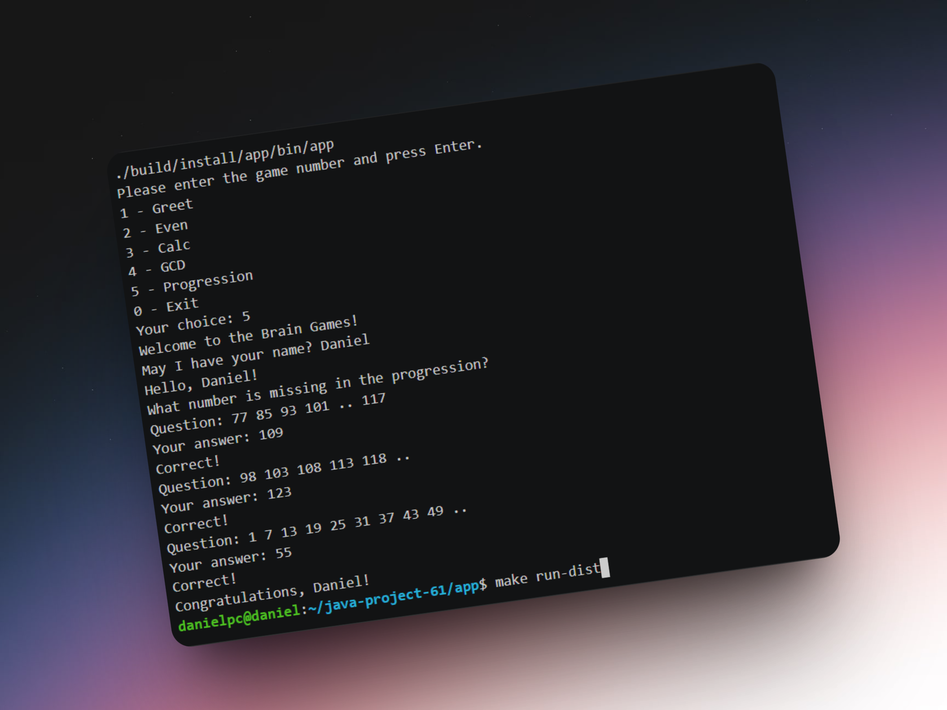 A collection of five terminal-based logic games developed in Java. Users solve challenges like arithmetic, GCD, and number progression in a console interface.