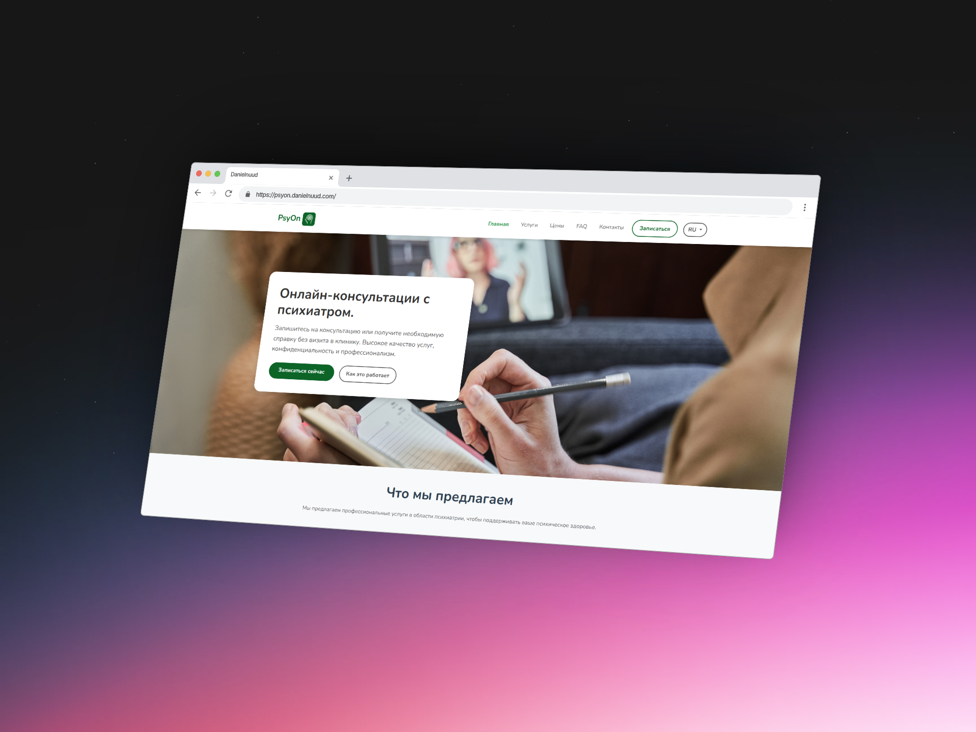 A clean and accessible landing page design for a digital psychiatry service, focused on trust, usability, and streamlined appointment booking.