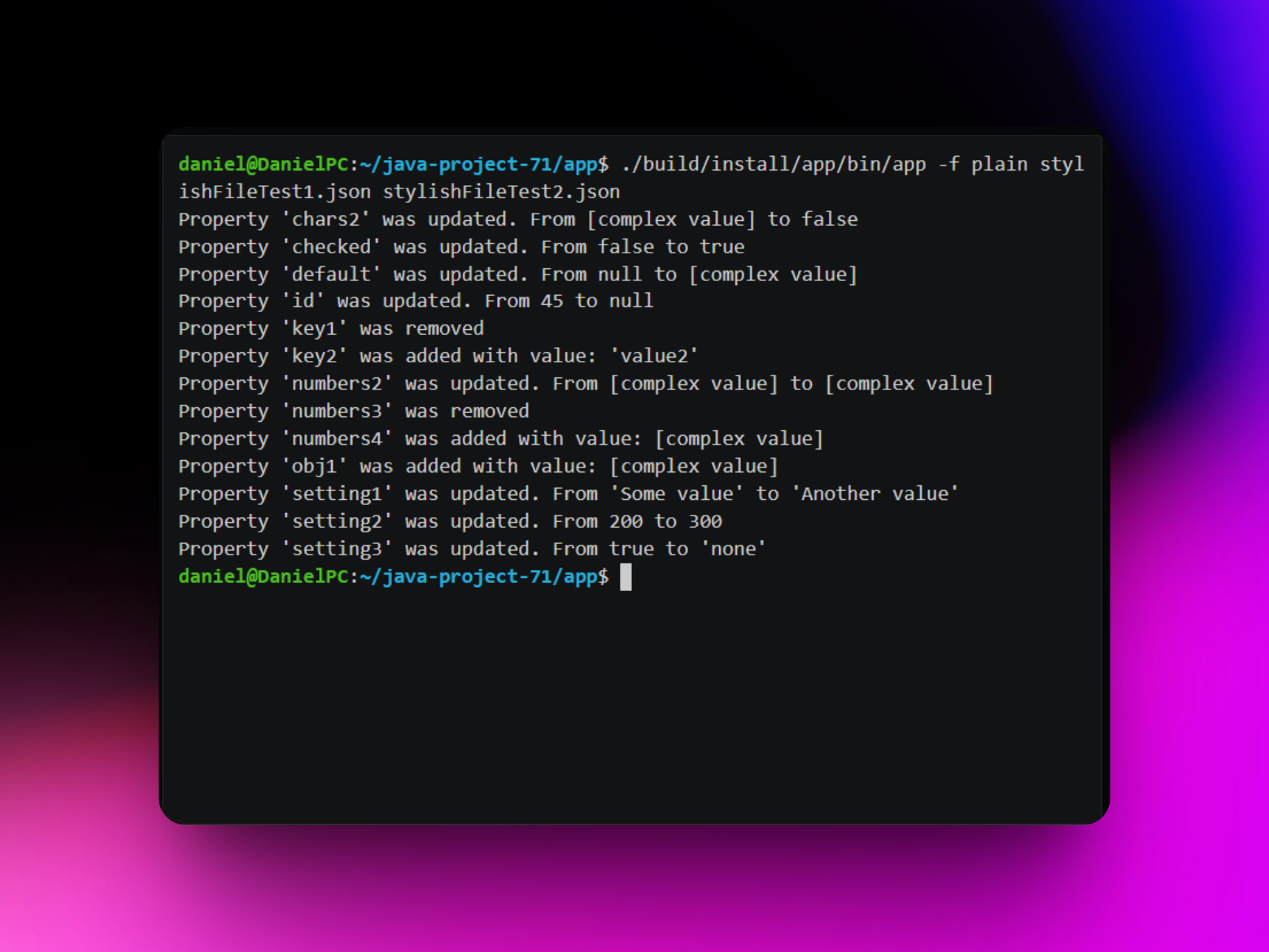Difference Calculator is a command-line utility built with Java, designed to determine the differences between two data structures. It supports both JSON and YAML formats, and offers multiple output styles including plain text, JSON, and stylish format.