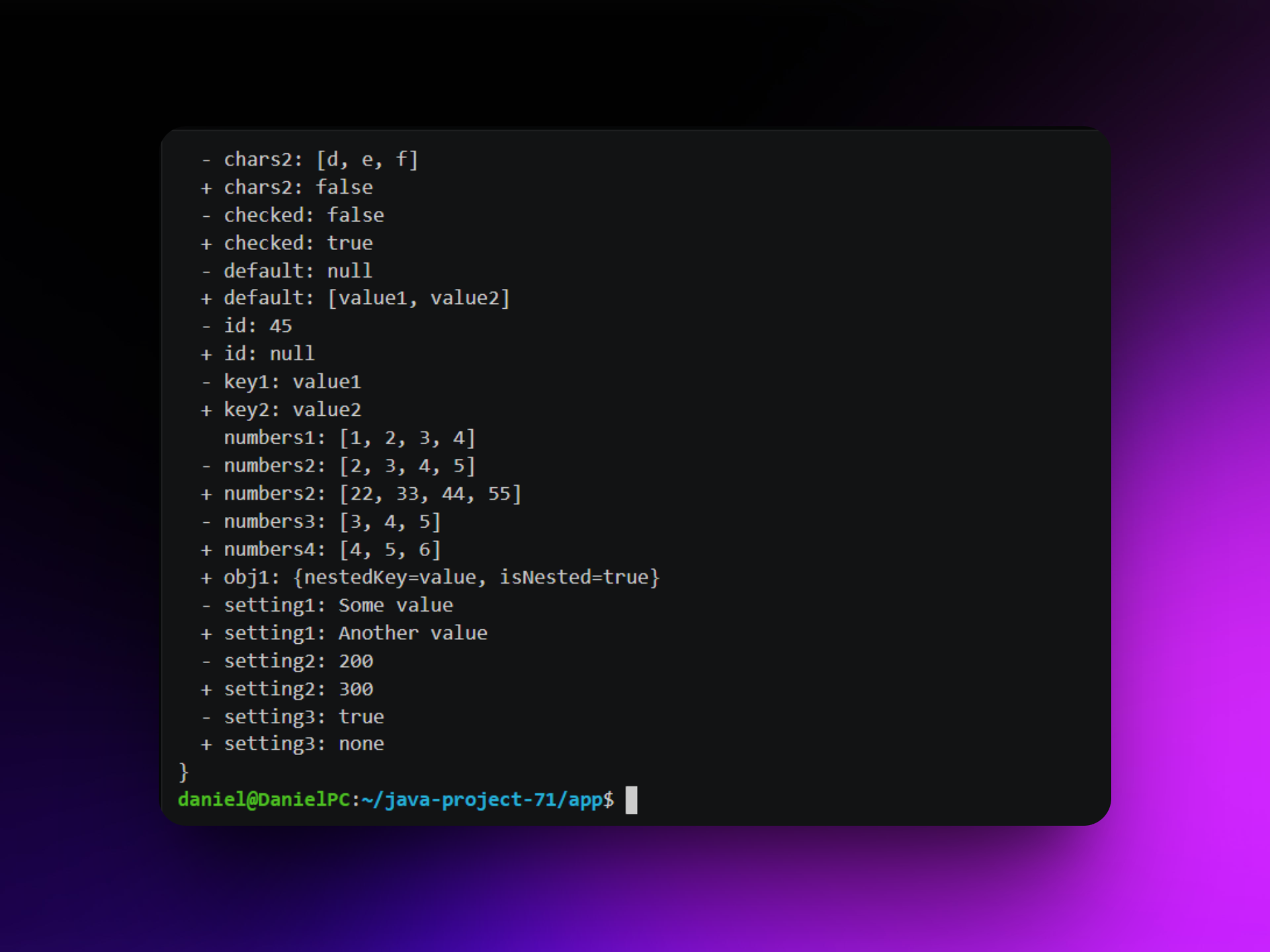 A terminal-based Java tool for comparing structured data in JSON and YAML formats. Displays differences in multiple output formats.