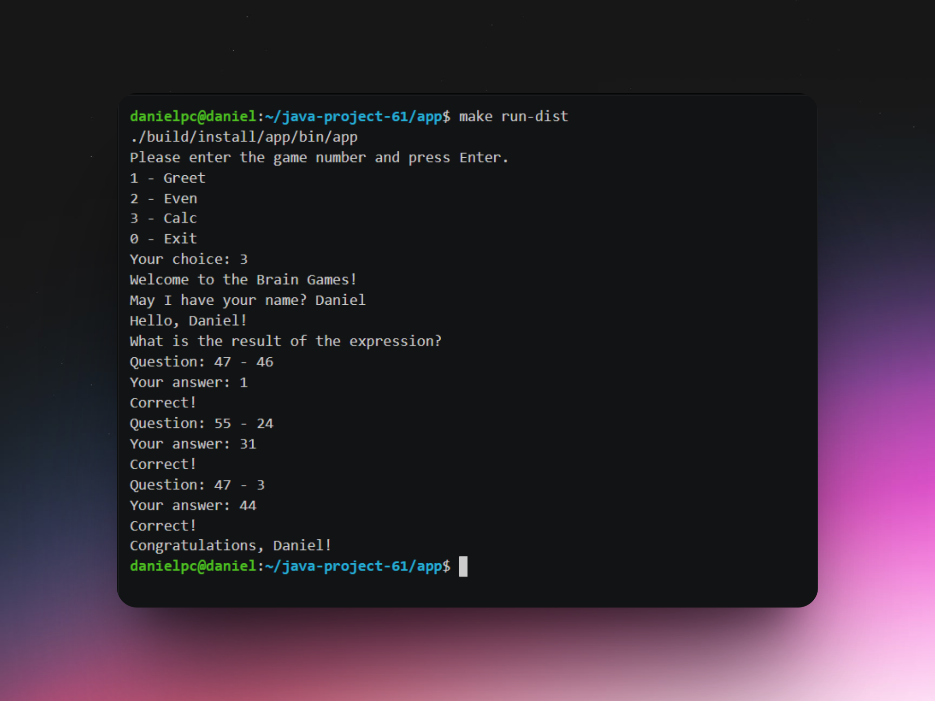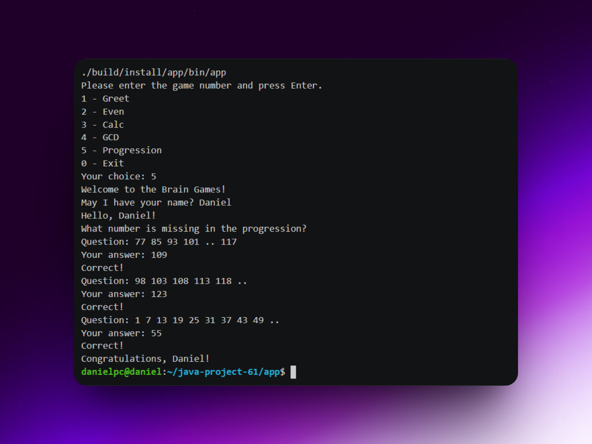 A collection of five terminal-based logic games developed in Java. Users solve challenges like arithmetic, GCD, and number progression in a console interface.