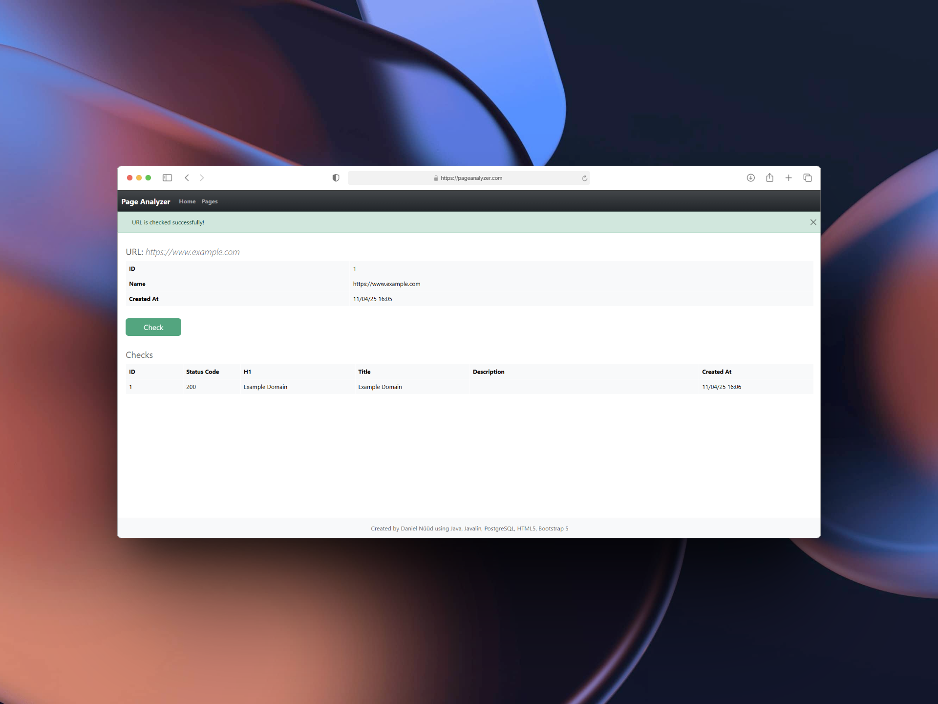 Page Analyzer is a lightweight web application designed to analyze the basic SEO parameters of websites. It was developed as part of a university Java course project, with the goal of building a complete backend solution from scratch.
