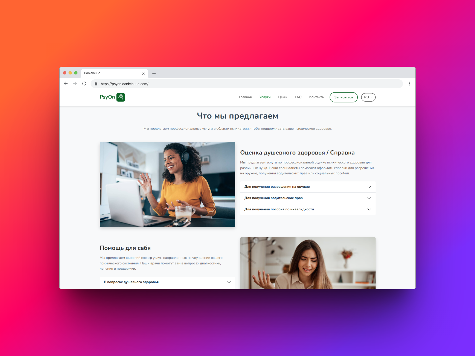 PsyOn is a landing page prototype for an online psychiatry service that offers remote consultations, digital certificate issuance, and easy scheduling. The goal was to create a professional yet approachable design that communicates trust and accessibility to users.